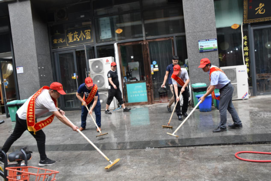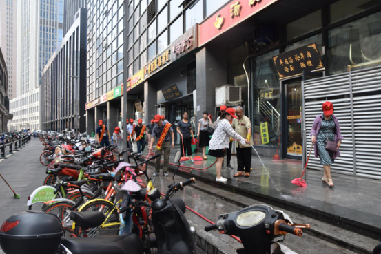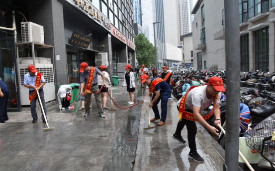 二、“全城清洁”行动。清洁家园,党员志愿者义不容辞。日前,市建投联合商务社区积极响应“全城清洁”行动号召,定期组织志愿者对社区单位公共区域、沿街商户门店等内外环境进行集中整治。7月14日下午,市建投党员志愿者分赴中国人保大厦对沿街商户门店和街道进行集中清理。大清扫活动采取包干打扫、分头行动的方式,集中对沿街商铺门店垃圾桶(池)、地面污渍等进行清洗,全面清理整治各类卫生死角,清理积存垃圾,杜绝垃圾乱堆乱放烈日炎炎,市建投党员志愿者们丝毫不惧37度的高温,头戴小红帽,戴着红袖标,以高度敬业态度和为人民服务的无比热情,全身心投入到环境卫生清理中,通过2个小时的辛苦劳动,使人保大厦沿街门店商铺和街道面貌焕然一新。