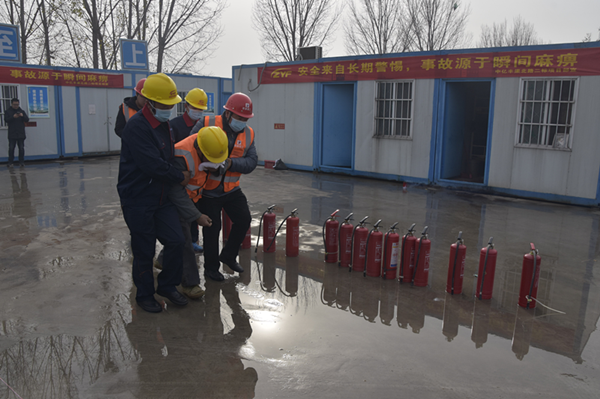 上午10点,演练活动正式开始。现场模拟了项目部工人宿舍因取暖设备漏电,引发火灾事故后,施工单位立即启动应急处置预案,通讯组、灭火组、疏散组、安全组分头行动,各负其责,为现场观众送上一幅幅井然有序的伤员救护、抢险灭火、善后安置等画面。最后,“伤员”被成功救出送医,火情完全得到控制。整个演练活动宣告完成。演练结束后,市消防协会工作人员还着重为大家讲解了火灾初期如何应对、灭火器的存放、使用注意事项等问题。现场观众体验了如何使用干粉式灭火器进行灭火。